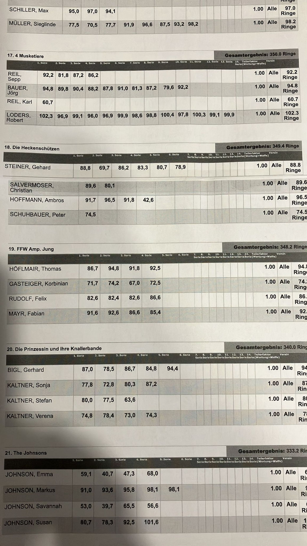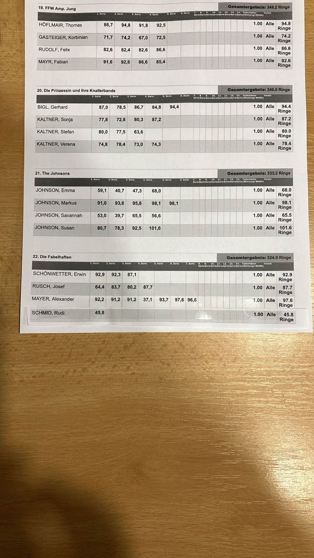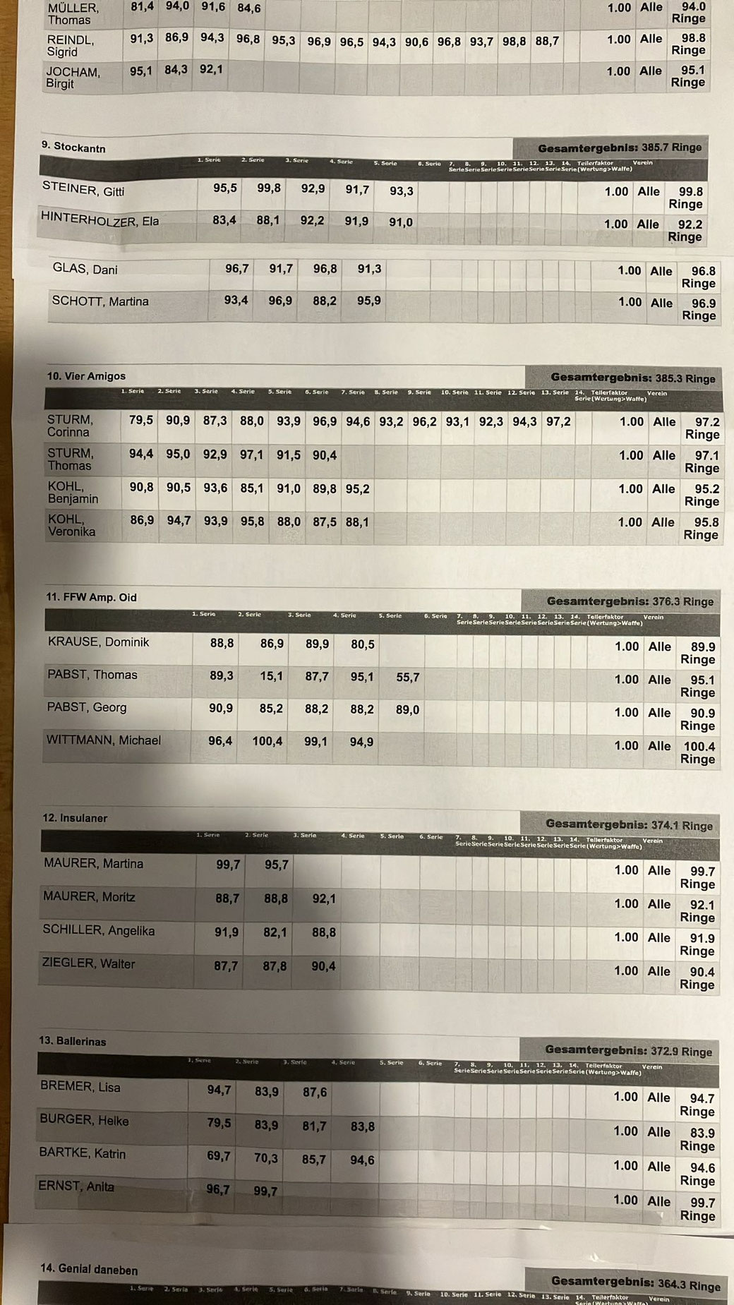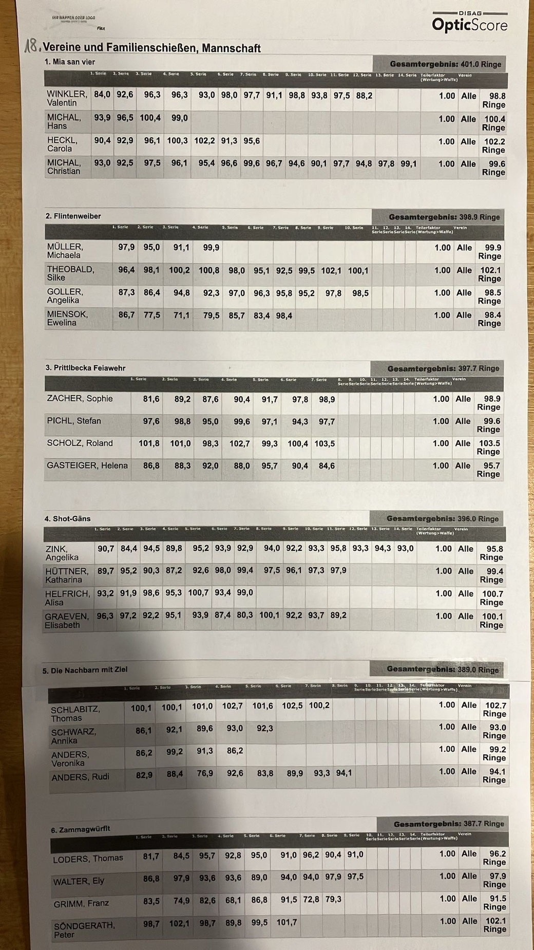 3. Platz "Prittlbecka Feiawehr" hatte ein Gesamtergebnis von 397,7 Ringen. Die Mannschaft bestand aus: Gasteiger Helena, Pichl Stefan, Scholz Roland, Zacher Sophie.